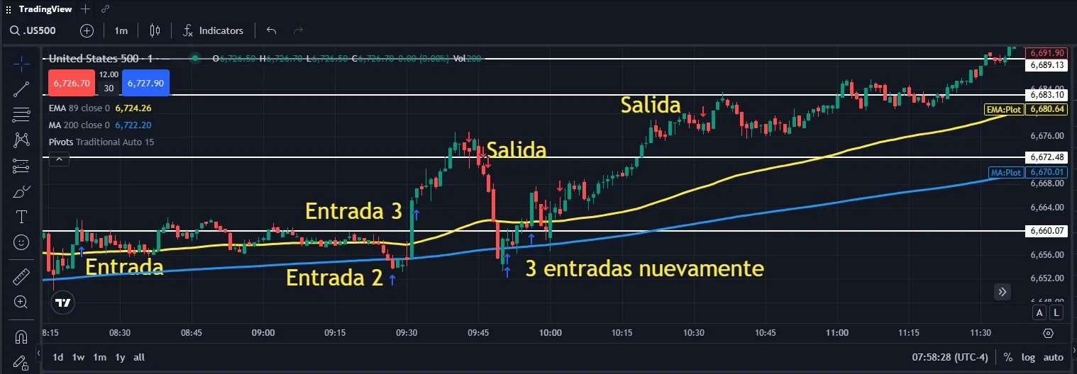 En el gráfico puedes observar el gráfico de 1 minuto con el SPX500, comienza la operativa con la primera entrada en la media móvil exponencial de 89, se agrega con orden límite en la media móvil simple de 200, y se incrementa la posición a mercado en un precio superior (tercera flecha azul) y se realiza la salida en la resistencia marcada en el plan de trading.