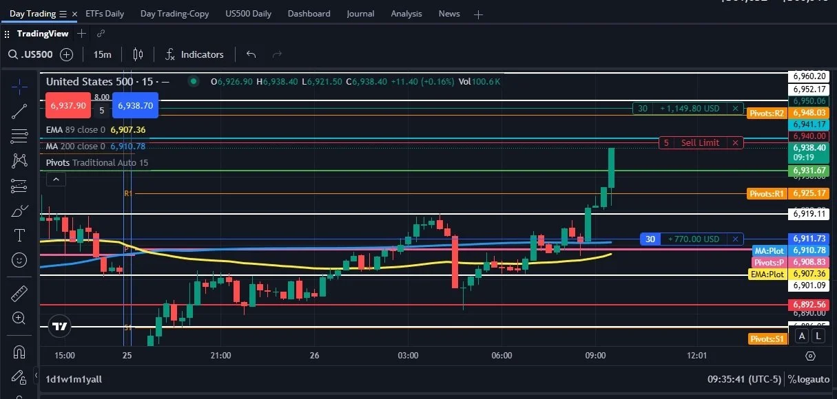 Otro ejemplo con TradingView en la cuenta Ufunded: en el gráfico de 15 minutos, con una media simple de 200 períodos, y una media móvil exponencial de 89 períodos. La entrada es en largo en la media móvil exponencial de 89, la línea amarilla.